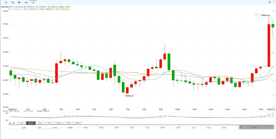 5月12日下午,在《中美日内瓦经贸会谈联合声明》发布后,比特币价格迅速拉升,突破105000美元,涨幅超1%